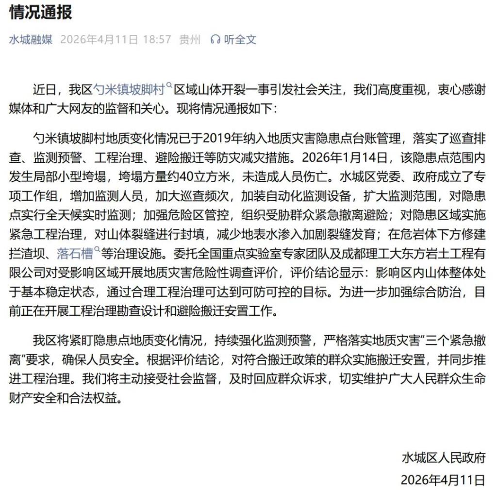 通报说 2026 年 1 月,六盘水市水城区勺米镇坡脚村区域隐患点发生过局部小型垮塌,水城区成立了专项工作组,增加监测人员,对隐患点实行全天候实时监测;组织受胁群众紧急撤离避险;对隐患区域实施紧急工程治理;在危岩体下方修建拦渣坝、落石槽等治理设施。同时委托专业机构对受影响区域开展地质灾害危险性调查评价,评价结论显示:影响区内山体整体处于基本稳定状态,通过合理工程治理可达到可防可控的目标。目前正在开展工程治理勘查设计和避险搬迁安置工作。