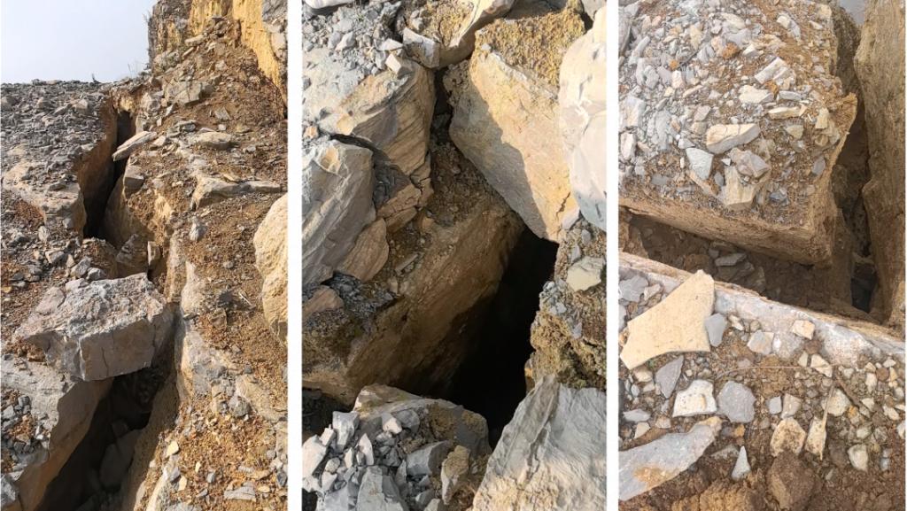 记者喘着气往上爬,脚下是几乎笔直的陡坡,两个半小时后,终于爬到约 600 米高的山脊上,再往上,就是高达 200 米左右的硬岩绝壁。村民掏出手机,给记者展示年前冒险拍摄的山顶画面:裂缝从几厘米到几米不等,最宽处有四五米,有的裂缝横跨整个山脊,长达数百米。