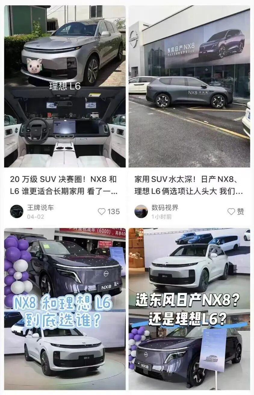 社交平台上突然涌现出大量日产 NX8 对阵理想 i6、L6 的 " 买车二选一 " 的对比帖