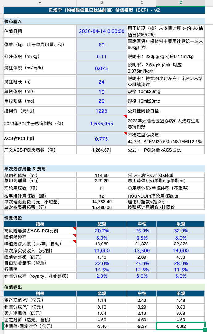 考虑到贝塔宁制剂专利将于2032年8月到期,不宜赋予过高的长期永续溢价。界面新闻测算,在中性假设下,按未来8至10年现金流折现,其资产现值约为4.48亿元。这和4.5亿元对价就接近,属于合理区间。但这一切都基于贝塔宁后续商业化能顺利放量。