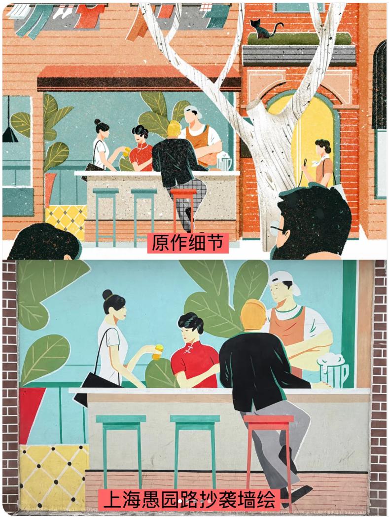 今年 3 月中旬,插画师李先生在上海愚园路偶遇一处沿街墙绘,画面抄袭了自己 10 年前的作品。他说," 对于原作者而言,即使是画面的一部分我也可以很远就认出来。"