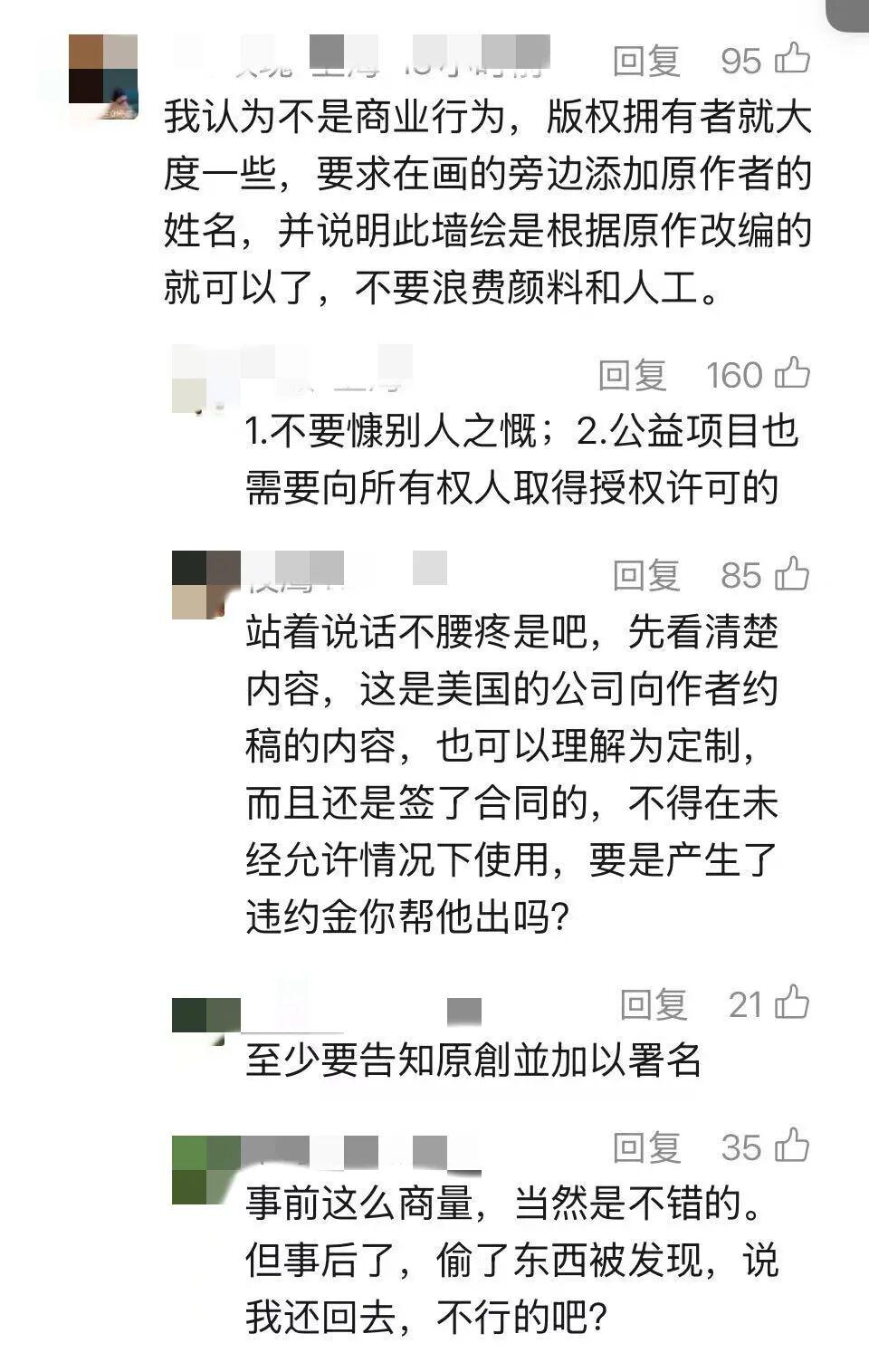 有网友认为,街头墙绘是公益项目,不是商业行为,版权作者应该 " 大方一些 ",这种想法遭到了不少网友的批评,要知法懂法!