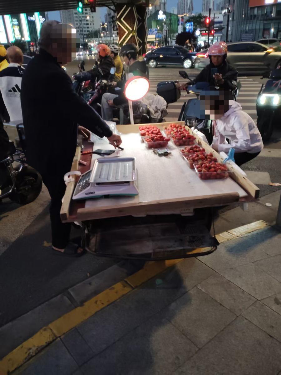 4 月 20 日晚 7 时左右,正逢高峰时段,记者来到现场看到,几个摊位一字排开,直接占据了机动车道与人行道的交界区域,有的甚至紧邻斑马线一端。此时正值车流高峰,往来车辆川流不息,摊主却熟视无睹,在摊位前招揽顾客。不时有车辆在摊位旁擦肩而过,场面十分惊险。