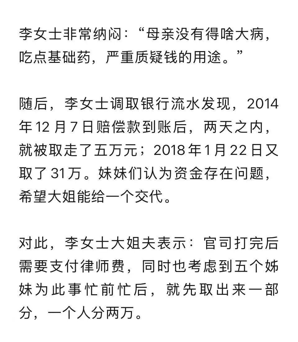 李女士表示,母亲今年已经 82 岁了,本来有五个女儿、一个儿子。10 年前家中最小的六弟弟意外去世,获得近 50 万赔偿款。