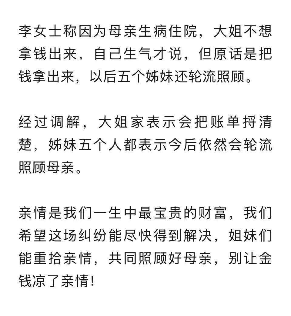 李女士大姐夫解释:把这些钱又另外存到自己家的卡上了。确实怨自己没有给大家说,但这笔账是一笔一笔都记录了。" 对老人我没有半点孬心!" 而老人的赡养问题是因为轮到自己家照顾时,(李女士)不让接了说把钱拿出来就啥也不用管了。
