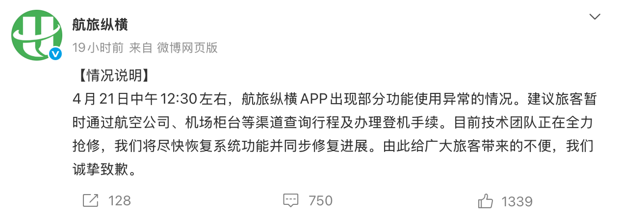 随后,航旅纵横发布情况说明称:“4月21日中午12:30左右,航旅纵横APP出现部分功能使用异常的情况。建议旅客暂时通过航空公司、机场柜台等渠道查询行程及办理登机手续。目前技术团队正在全力抢修,我们将尽快恢复系统功能并同步修复进展。由此给广大旅客带来的不便,我们诚挚致歉。”