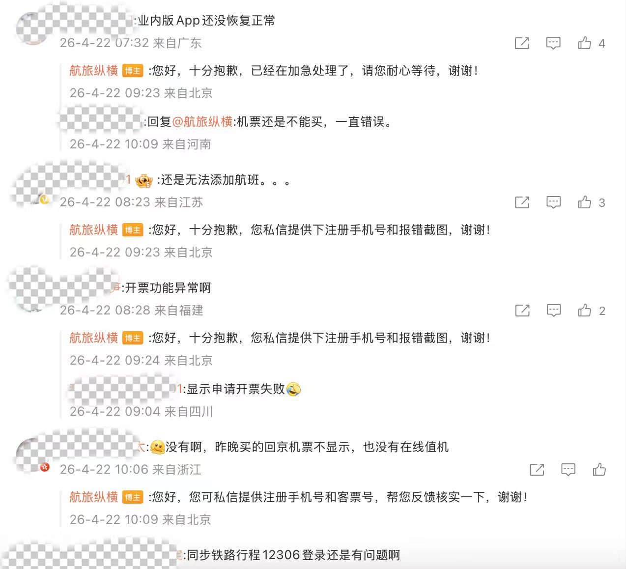 不过界面新闻注意到,在该条微博的评论区,仍有多个网友反映无法添加航班、开票功能异常等问题。其中,对于有网友提出的业内版APP还没恢复正常的问题,航旅纵横回复称:“十分抱歉,已经在加急处理了。”