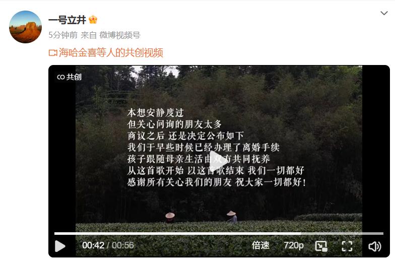 4 月 24 日,李亚鹏前妻海哈金喜在社媒发视频回应复婚问题:" 我们都是夏夏的父母,不会不联系和尴尬,反倒我们现在沟通比以前更顺畅了。我们都很好,谢谢大家关心。"