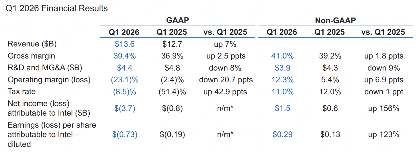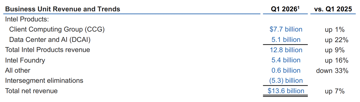 财报数据显示,英特尔一季度总营收达136亿美元,同比增长7%,较公司此前给出的指引中值高出14亿美元,大幅跑赢华尔街预期。