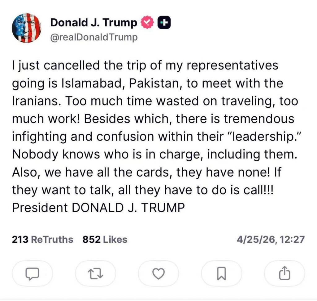 在伊朗代表团结束对巴基斯坦的访问之后,美国总统特朗普 25 日在社交媒体上宣布,他取消了美方代表前往巴基斯坦首都伊斯兰堡 " 与伊朗方面会晤 " 的行程。