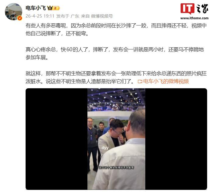 IT 之家注意到,博主 @电车小飞 昨晚分享了一则视频,并透露余承东当时在长沙摔了一跤,而且摔得还不轻。视频中,余承东与宁德时代董事长曾毓群会面时表示,摔断了(预计指骨头摔断了),不过已经好多了,但现阶段骨头长得不太能弯。