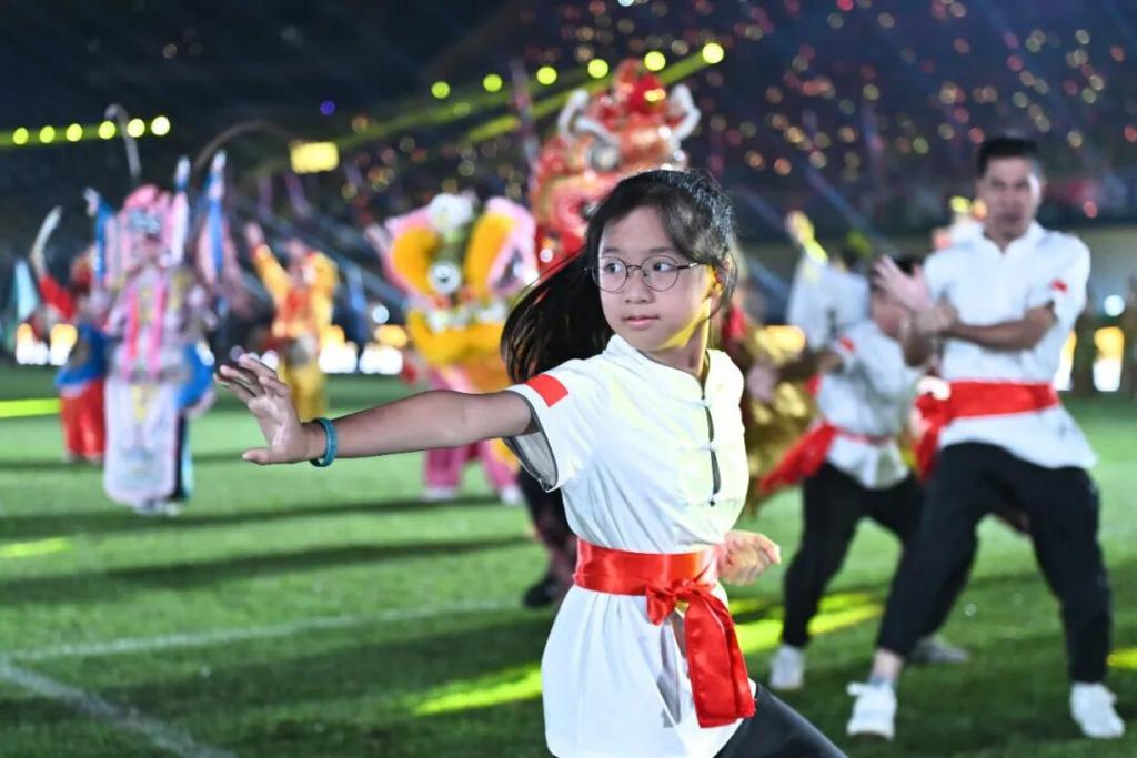 开幕式最令人激动的集体记忆时刻,由广东籍世界冠军林高远和广东本土歌手 " 东山少爷 "(廖寰)领衔,全场近 1.2 万观众合唱经典粤语名曲《海阔天空》,歌声响彻越秀山体育场的上空,余音绕梁,将现场气氛推上了巅峰。《海阔天空》堪称广东省 " 省歌 ",自 1993 年诞生以来迅速在南粤大地广为流传,成为广东人最有共鸣的集体记忆之一。这首歌曲风大气磅礴,歌词积极向上,代表了广东人坚持理想永不放弃的信念。