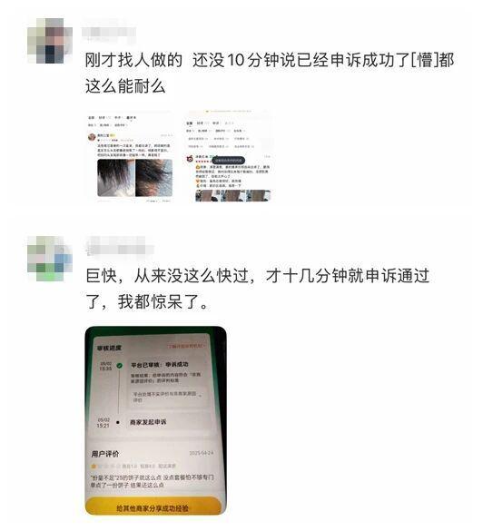 有用户晒出了差评删除前后的对比图,并配文称 " 刚找人处理完,还不到十分钟就说申诉成功了 "。图片显示,该用户发布的关于烫发的差评确实已经消失,这段话术也在多个话题帖中反复出现,疑似是水军引流话术。