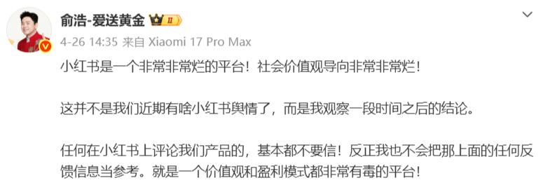 从 4 月 26 日开始,追觅科技 CEO 俞浩连发数条微博炮轰小红书,声称 " 任何在小红书上评论追觅产品的内容基本都不要信,我不会把小红书上反馈的关于我们产品的任何信息当参考 "。