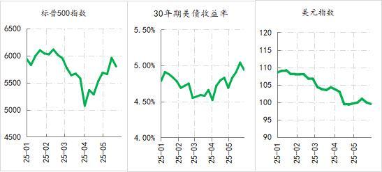 美元指数持续走弱,美元指数在1月13日触及110.18高点后,就持续下降处于弱势,最低降至97.91,目前在100下方。美股与美债则同步剧烈波动,标普500指数于2月19日触及6147.43后,一度跌至4842.94,后逐步回升至5900点附近,30年期美债收益率于继1月份向上突破5%之后,最低下行至4.33%,5月则再次向上突破5%,目前仍在4.9%上方。