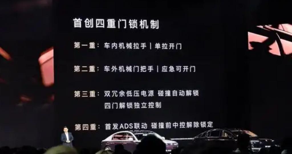 余承东在发布会表示,尊界 S800 首创四重门锁机制。据其介绍,第一重是车内机械拉手,单拉开门;第二重是车外机械门把手,应急可开门;第三重是双冗余低压电源,碰撞自动解锁,且四门解锁独立控制;第四重首发 ADS 联动,碰撞前中控解除锁定。