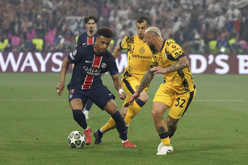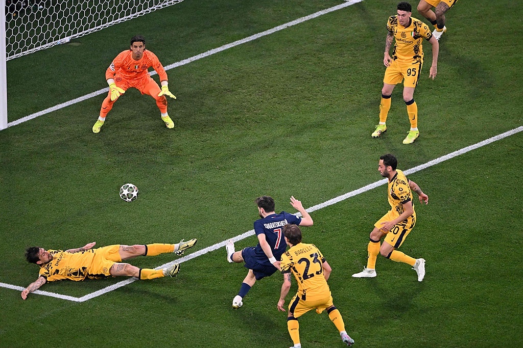 前两个丢球就是最好的例子。第一球,克瓦拉茨赫利亚左侧突破后,球被转移给禁区外的维蒂尼亚,结果国米多达5人向其靠拢,葡萄牙中场直塞给前插的杜埃,后者横传给阿什拉夫,阿什拉夫的身边几米内没有防守球员,轻松破门。