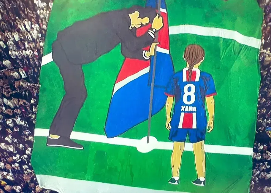 赛后,安联球场出现了一个让人动容的TIFO,主角是恩里克和他已故的女儿莎娜,2015年恩里克率领巴萨夺得欧冠冠军时,他和女儿莎娜赛后一起挥舞巴萨旗帜的画面让人印象深刻,然而2019年莎娜因病去世,恩里克此前多次表示,作为父亲,希望在巴黎做同样的事情,以纪念女儿,这一次他换上了一件特别T恤并深情告白。