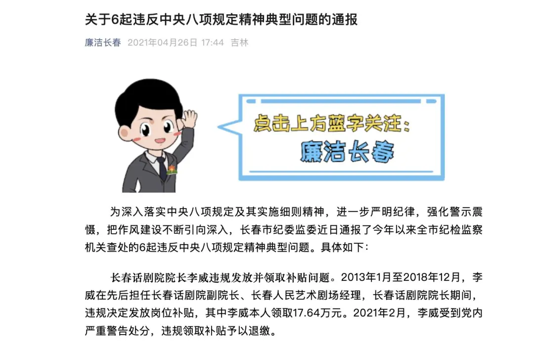公开信息显示,演员李威曾是长春话剧院院长。2021年,长春市纪委监委通报了长春话剧院院长李威违规发放并领取补贴问题。2013年1月至2018年12月,李威在先后担任长春话剧院副院长、长春人民艺术剧场经理,长春话剧院院长期间,违规决定发放岗位补贴,其中李威本人领取17.64万元。2021年2月,李威受到党内严重警告处分,违规领取补贴予以退缴。