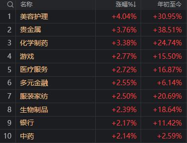 板块方面,美容护理、足球概念、创新药、宠物经济等板块涨幅居前,汽车整车、钢铁、白酒、煤炭等板块跌幅居前。