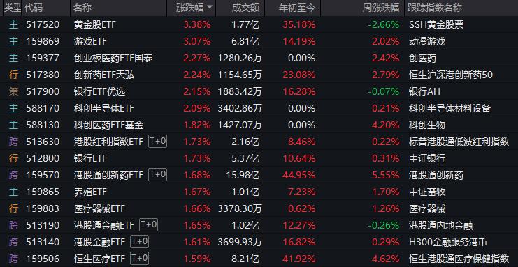 Wind 数据显示,截至收盘,黄金股 ETF、游戏 ETF 以及银行 ETF 的涨幅相对领先。