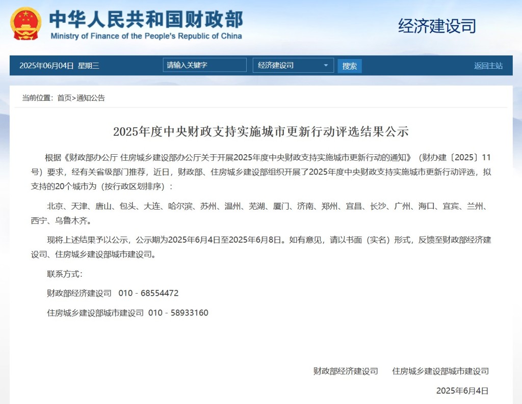 6月4日,财政部经济建设司、住房城乡建设部城市建设司发布《2025年度中央财政支持实施城市更新行动评选结果公示》,近日,财政部、住房城乡建设部组织开展了2025年度中央财政支持实施城市更新行动评选,拟支持的20个城市为:北京、天津、唐山、包头、大连、哈尔滨、苏州、温州、芜湖、厦门、济南、郑州、宜昌、长沙、广州、海口、宜宾、兰州、西宁、乌鲁木齐。