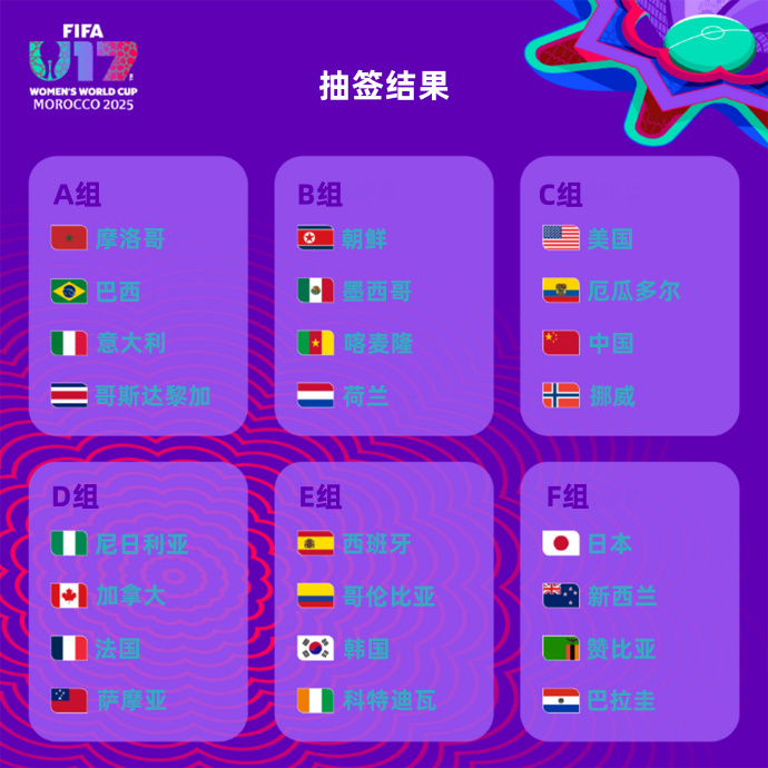 国际足联5日公布了2025年17岁以下女足世界杯的抽签结果,中国队与美国队、挪威队和厄瓜多尔队同分在C组。