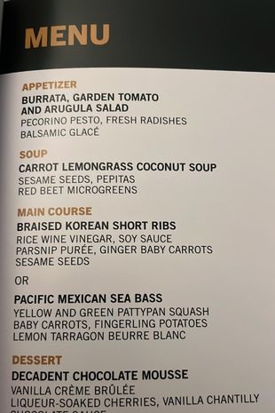 客人们还想要更多,开胃菜Burrata花园沙拉配胡萝卜柠檬草椰子汤。接下来的晚餐是短排骨或海鲈鱼,优雅的甜点选择包括“颓废”的巧克力慕斯,让这顿饭在高潮中结束。