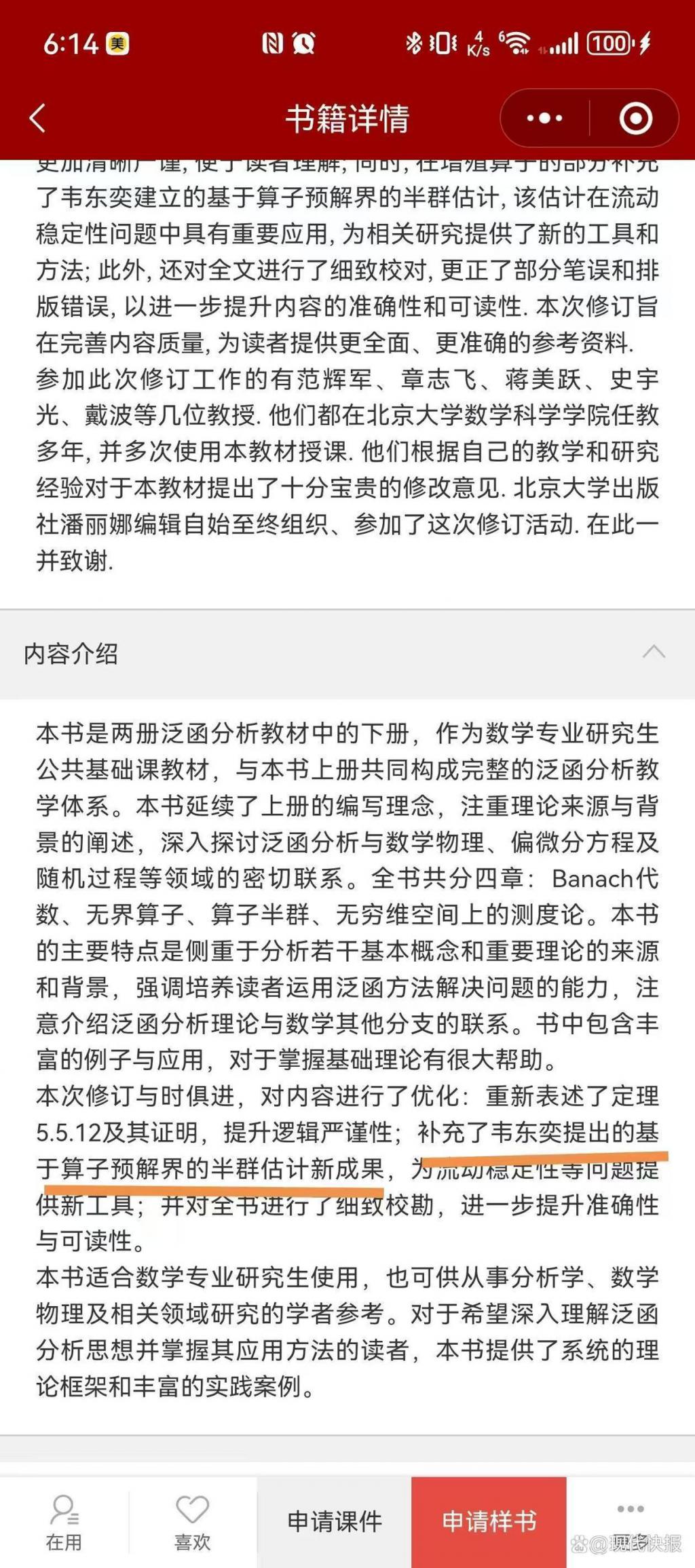 现代快报记者了解到,《泛函分析讲义(第二版)(下)》由北京大学出版社在 2025 年 5 月出版。这是两册泛函分析教材中的下册,作为数学专业研究生公共基础课教材使用。记者从北京大学出版社官方小程序中看到,第二版中补充了韦东奕提出的基于算子预解界的半群估计新成果,为流动稳定性等问题提供新工具。不过,这一成果是否被命名为“韦东奕定理”,并未有权威依据。