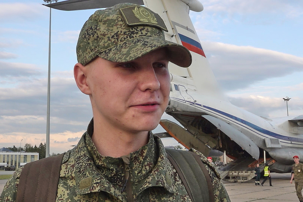 当地时间2025年6月9日,俄罗斯国防部新闻处发布的视频画面显示,一名从乌克兰被俘后返回俄罗斯军人在机场接受采访。