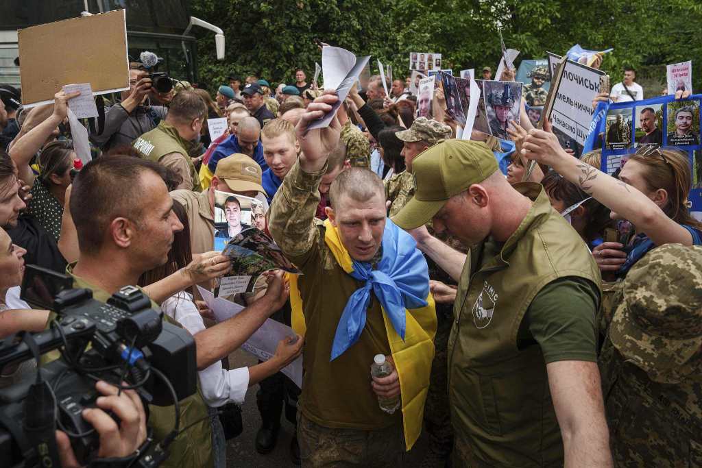 当地时间2025年6月9日,乌克兰切尔尼戈夫地区,俄罗斯与乌克兰交换战俘后,乌克兰士兵穿过人群寻找亲属。