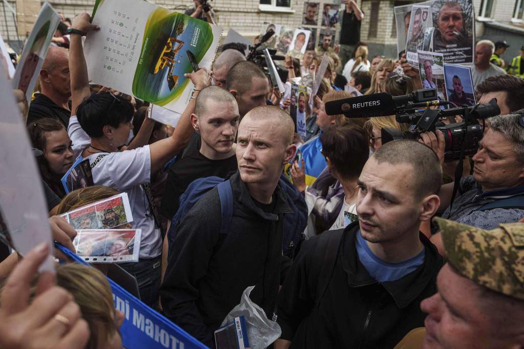 当地时间2025年6月9日,乌克兰切尔尼戈夫州,被释放的乌克兰战俘在人群中寻找亲人。