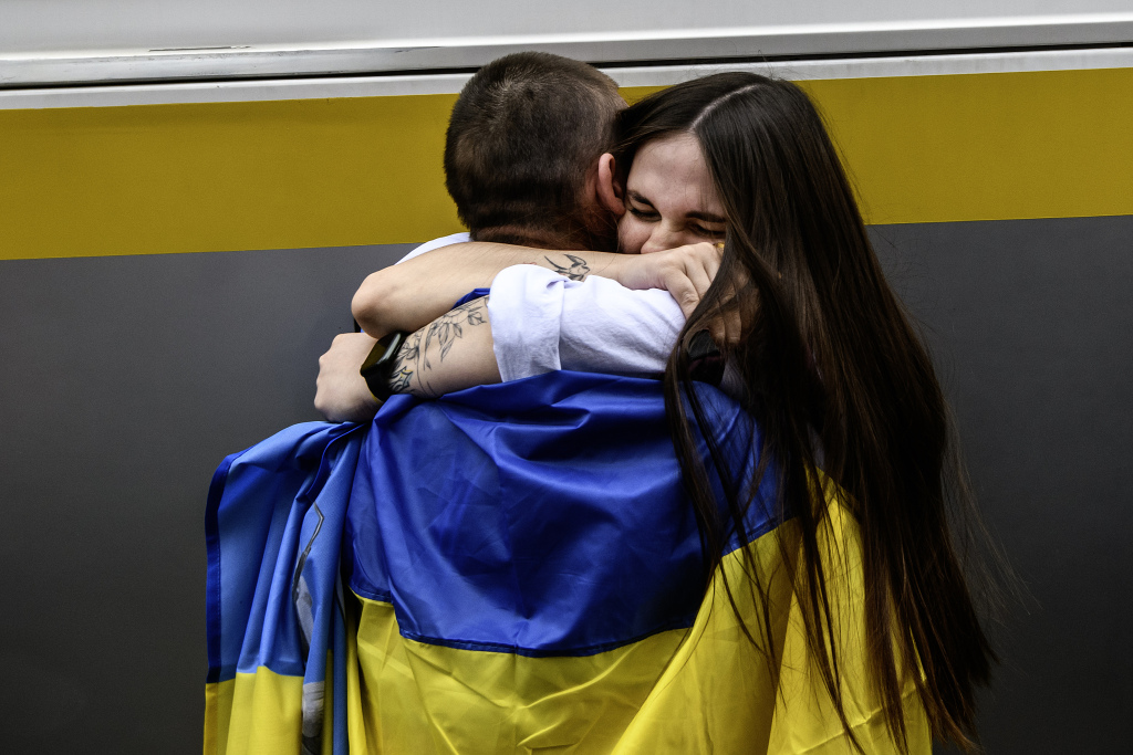 当地时间2025年6月9日,乌克兰切尔尼戈夫州,乌克兰与俄罗斯进行首批战俘交换,乌克兰战俘与久别的亲人重逢。