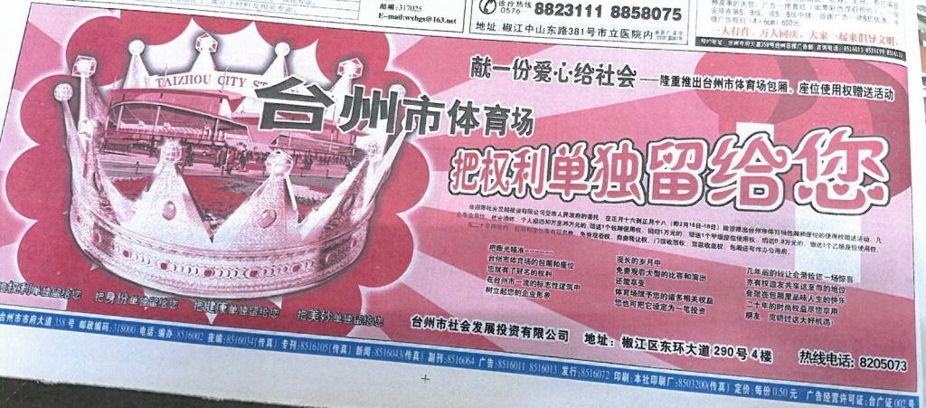 2003年2月,台州市社会发展设资有限公司(以下简称“社发集团”)受市人民政府的委托,推出台州市体育场40个包厢和1281个座位的使用权赠送活动,本意是缓解建设初期的资金压力。根据当年公开发布的方案,凡企事业单位、社会团体、个人捐赠30万元至35万元的,将获赠一个8人座的包厢,捐赠1万元者获赠一个甲级座位,捐赠8000元者获赠一个乙级座位,所有座位的使用权有效期为20年。该活动通过本地媒体渠道多次报道宣传,得到了市民广泛响应,相关包厢和座位最终全部赠出。社发集团向捐赠者颁发“荣誉卡”,并签署了捐赠协议。