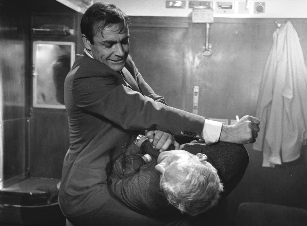 1963年电影《来自俄罗斯的爱情》剧照,肖恩·康纳利在片中展示了令人窒息的暴力场面,但他的脸颊上可没有疤痕
