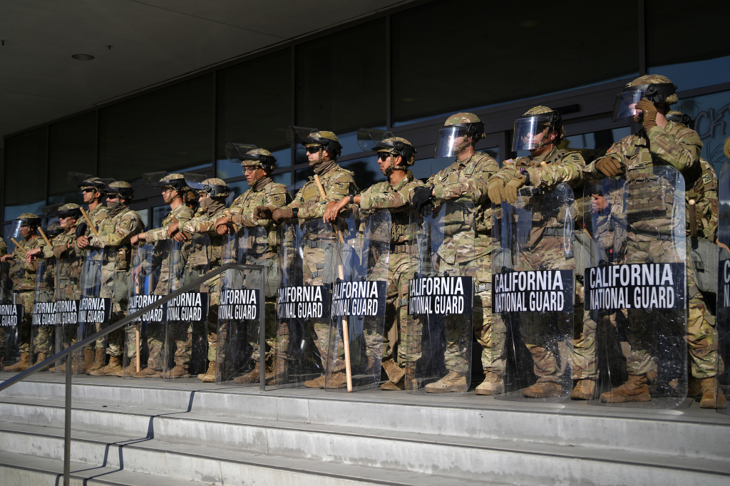 当地时间2025年6月10日,美国加州洛杉矶市中心,加利福尼亚州国民警卫队在联邦大楼前列队执勤。