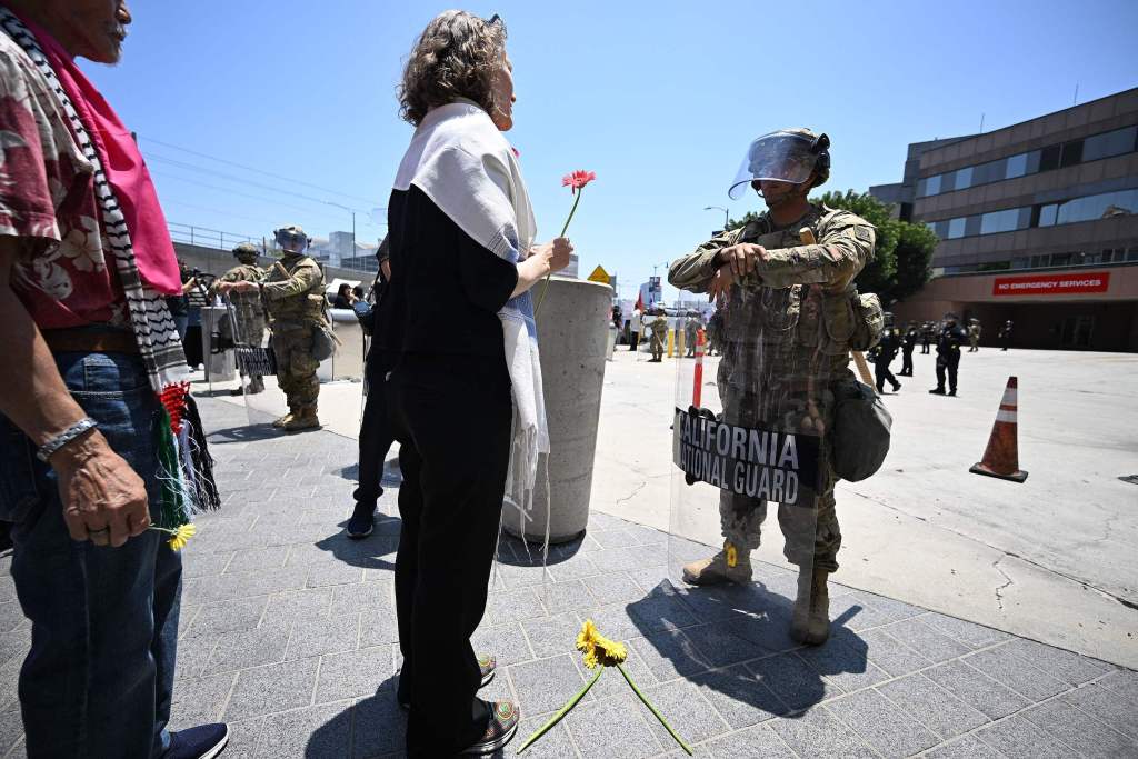 当地时间2025年6月10日,美国加州洛杉矶,一名示威者在抗议中手持鲜花,准备献给在联邦大楼外执勤的国民警卫队士兵。