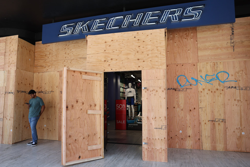 当地时间2025年6月10日,美国加州洛杉矶,一名男子站在一家被木板封住的斯凯奇零售店外,此前一天该店遭到骚乱者的洗劫。
