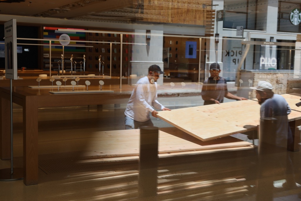 据悉,被洗劫一空的多家店铺,包括苹果、阿迪达斯和T-Mobile等商店。10日,洛杉矶市中心的商家纷纷用胶合板封店防止洗劫。