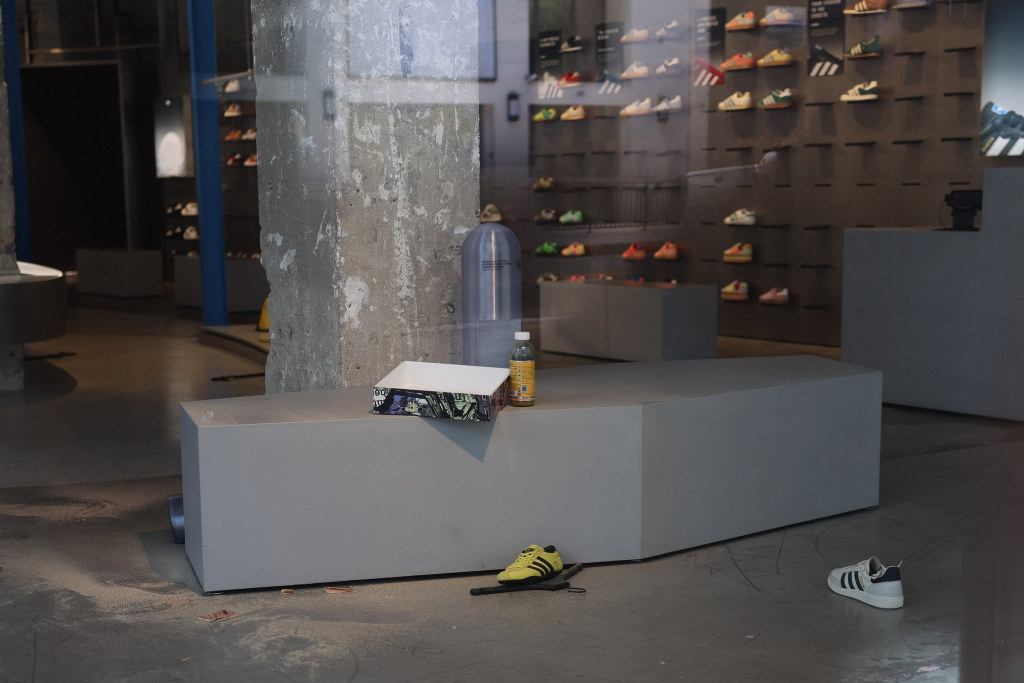 当地时间2025年6月10日,美国加州洛杉矶,一家阿迪达斯零售店的地面上散落着前一天被骚乱者抢劫后留下的少量鞋子。