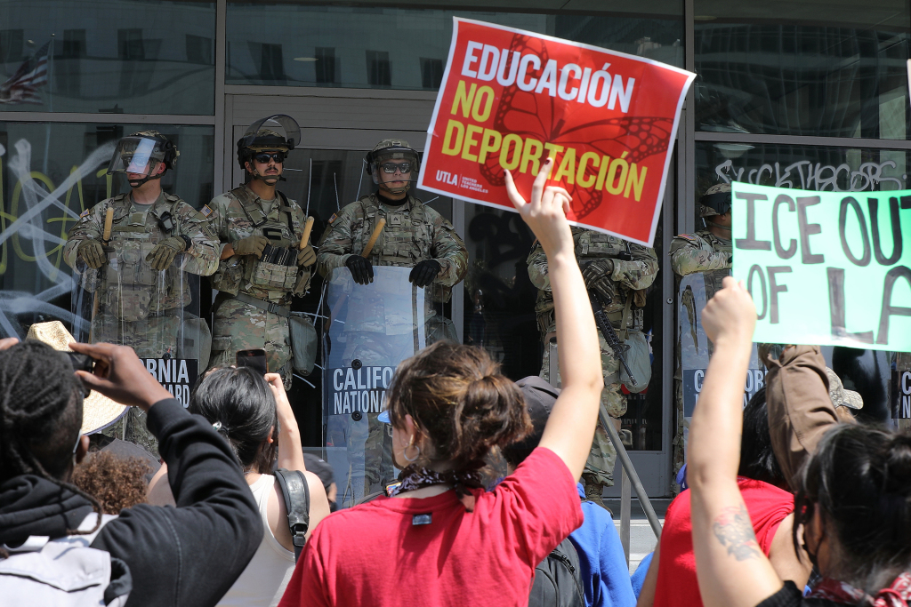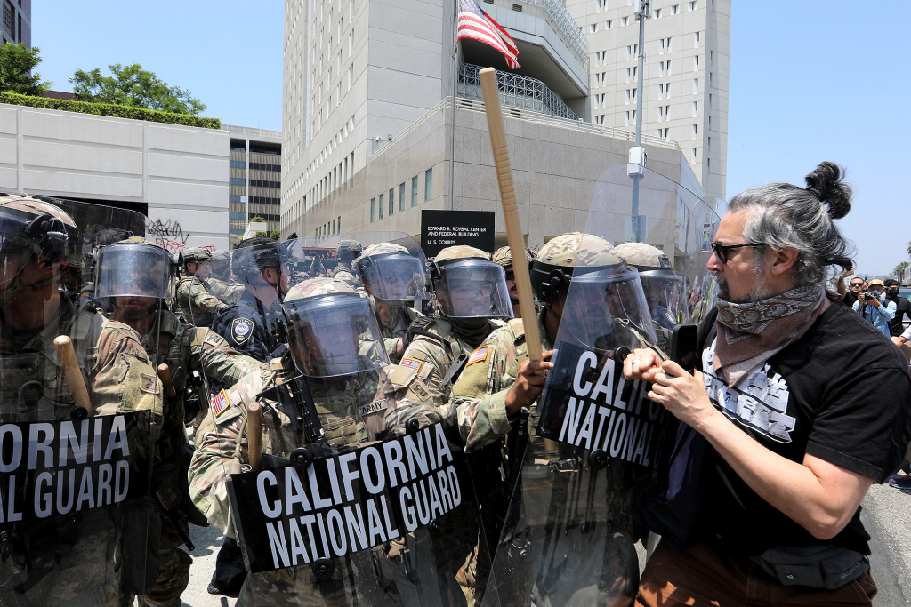 6月9日,在美国加州洛杉矶一处联邦机构建筑外,示威者与国民警卫队人员对峙。