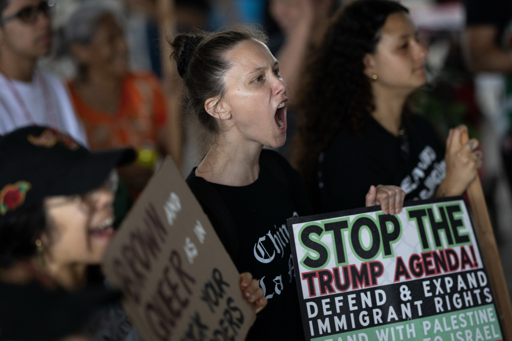 当地时间2025年6月8日,美国伊利诺伊州芝加哥,在以西班牙裔居民为主的皮尔森社区,示威者聚集抗议近期美国移民与海关执法局(ICE)在该市的突击搜捕行动。