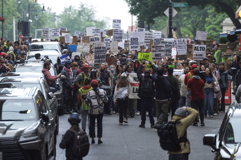 当地时间2025年6月10日,美国马萨诸塞州波士顿,示威者在街头游行,呼吁美国移民和海关执法局(ICE)撤出马萨诸塞州和洛杉矶。