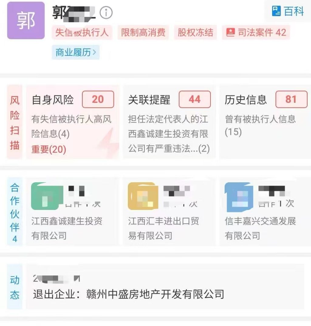 企查查显示,目前郭某某在赣州中盛房地产开发有限公司已经没有股权。历史记录显示,有两项变更和郭某某有关。2023年8月,该公司主要人员发生变更,新进一名董事长,此时郭某某职务仍为经理;2024年2月,该公司协助法院变更股东,郭某某持股减少16.3333%,“退出”。至此,赣州中盛房地产开发有限公司股东持股信息中不再记载郭某某。