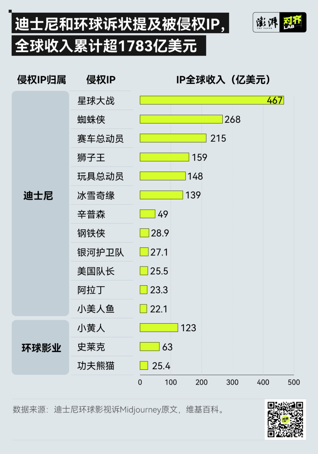 据不完全统计,迪士尼和环球影业在诉状中指出被侵权的IP超过15个,IP累计全球收入超过1738亿美元。据界面新闻报道,迪士尼高级执行副总裁、首席法律与合规官霍拉西奥·古铁雷斯表示,“我们的世界级IP建立在数十年资金投入、创意与创新之上,盗版就是盗版,由AI公司实施这一事实并不会减轻其侵权性质。”