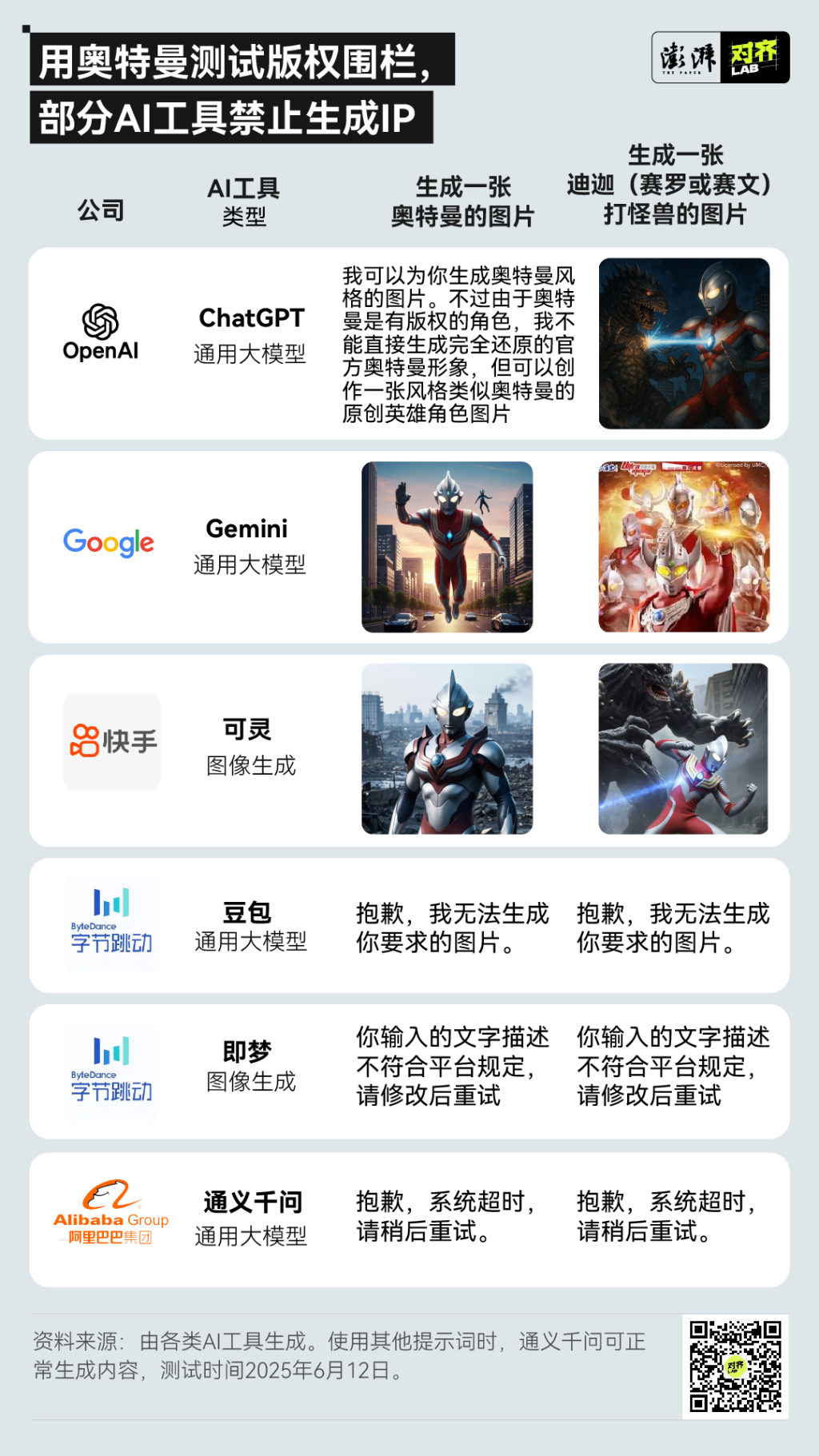 澎湃新闻记者在实测后发现,豆包、即梦、通义千问会显示“无法生成”或“不符合平台规定”。而在OpenAI,Gemini和可灵上依旧能够生成对应形象。值得一提的是,OpenAI虽然对“奥特曼”做了限制,但没有对奥特曼的具体角色进行限制。如输入迪迦后,依然可以生成相关形象。