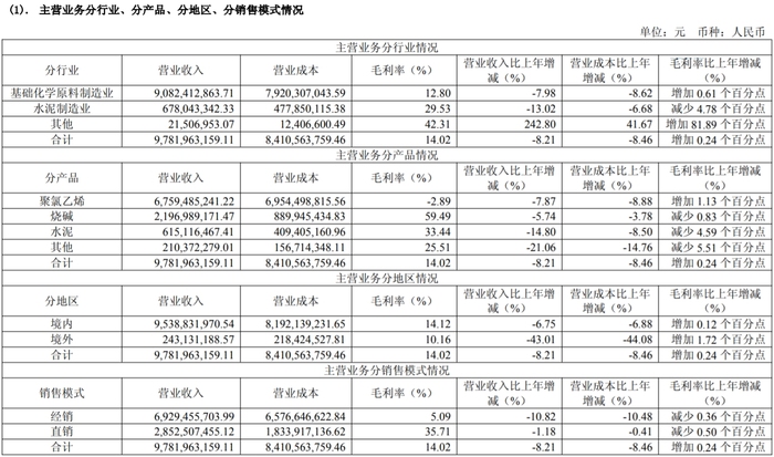 2024年财报显示,年内公司三大主营产品PVC、烧碱、水泥的营收规模均同比下滑。盈利能力方面,除PVC毛利率为负,烧碱、水泥的毛利率也在下滑。