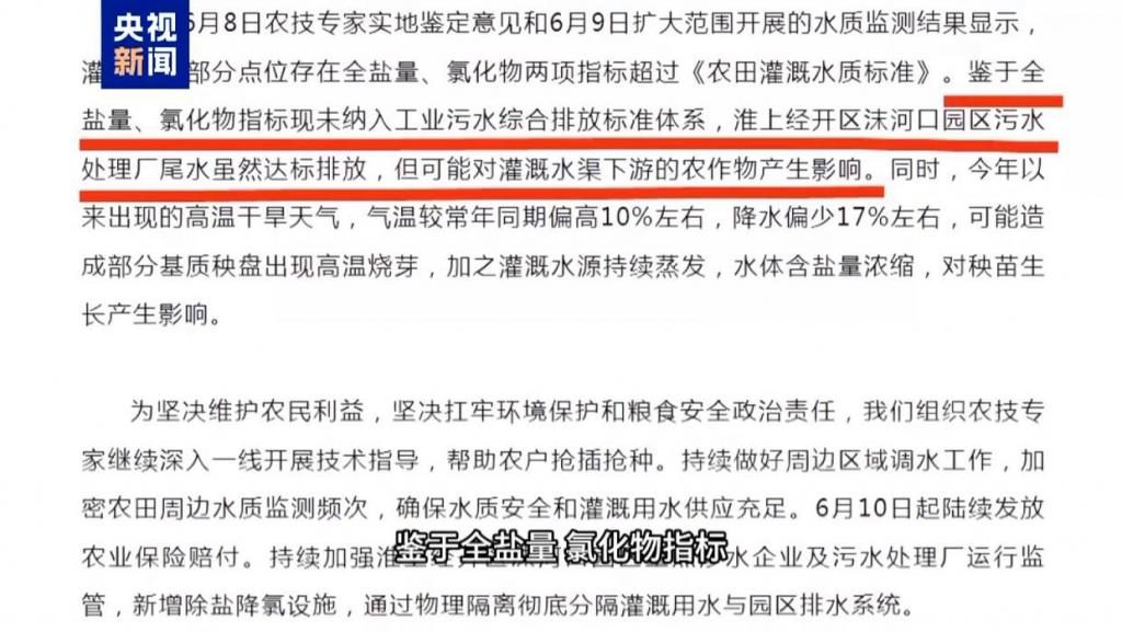 通报称:鉴于全盐量、氯化物指标现未纳入工业污水综合排放标准体系,淮上经开区沫河口园区污水处理厂尾水虽然达标排放,但可能对灌溉水渠下游的农作物产生影响。
