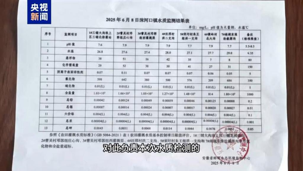根据 6 月 10 日蚌埠市及淮上区联合工作组的情况通报,三铺大沟的灌溉区域部分点位存在全盐量、氯化物两项指标超过《农业灌溉水质标准》。
