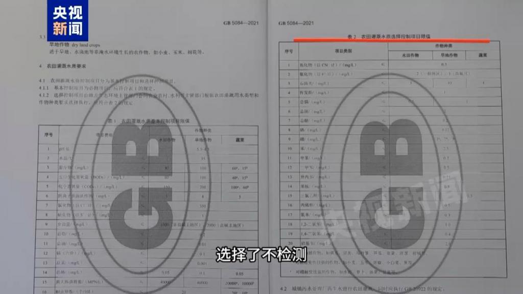 记者注意到,蚌埠生态环境监测中心在对灌溉水水质检测时,依据的是生态环境部和国家市场监督管理总局联合发布的《农田灌溉水质标准》,但只检测了表一中的必测项目,而对苯类物质等列入表二的选择性检测项目选择了不检测。对此,负责本次水质检测的安徽省蚌埠生态环境监测中心主任葛朝军表示,以后再说。